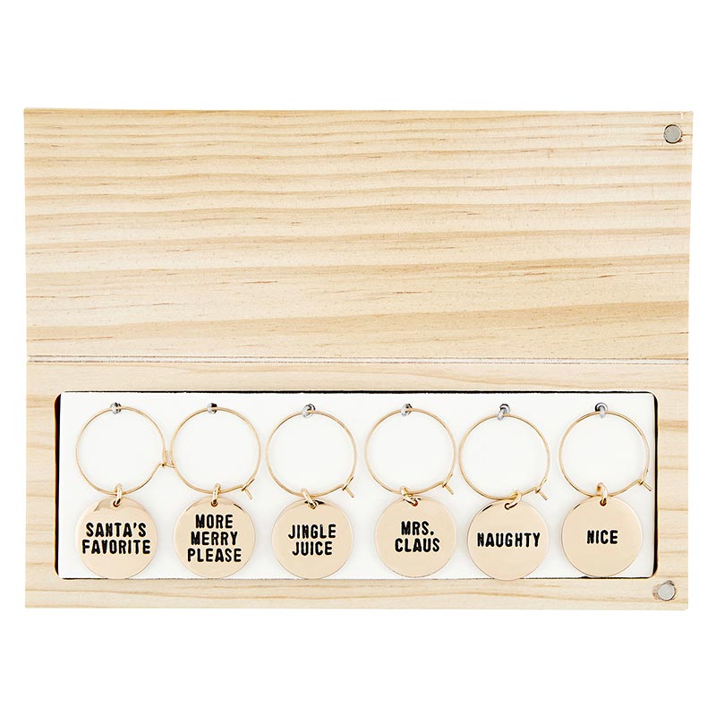 Celebrate this holiday season with style! Our Holiday Wine Charms in Wood Box make the perfect gift for your loved ones. This set of 6 will add a festive touch to any gathering! Enjoy wine with your favorite people and spread some holiday cheer!