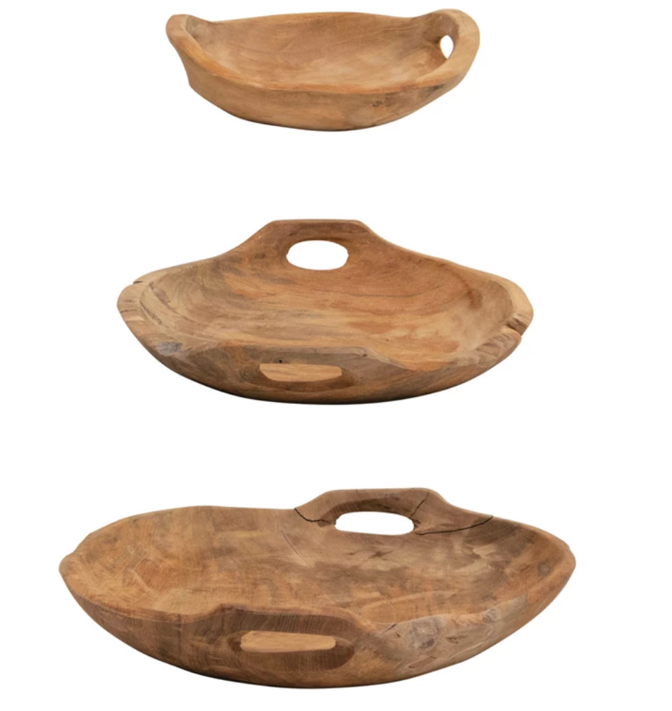 hese bowls mix simplicity with uniqueness and are a perfect addition to any kitchen. Since each one is hand-carved, Each one will vary slightly. Features handles for easy transportation.